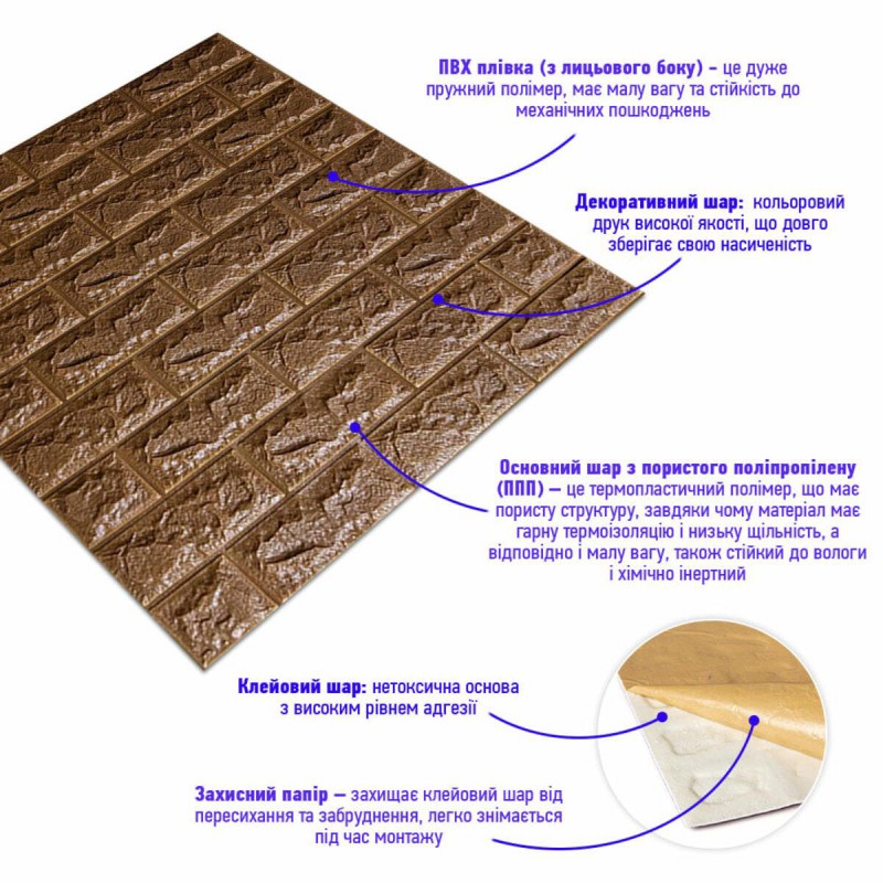 Самоклеящиеся 3D панели – декоративное покрытие для стен, выполненное из легкого и прочного материала – пористого полипропилена (ППП). Основная особенность - рельефный рисунок в виде кирпичей в широком разнообразии цветовой гаммы и наличие клеевого слоя, что позволяет установить панели без необходимости применения дополнительных материалов.