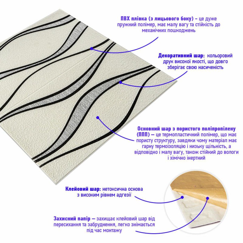 Материал панелей - вспененный полипропилен. Это полностью безопасный и нетоксичный материал, который имеет свойства шумопоглощения и утепления. А широкий выбор рисунков позволит сделать ваш интерьер уникальным и неповторимым.