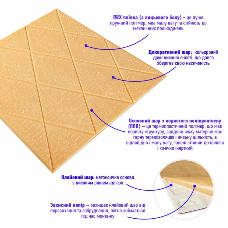Материал панелей - вспененный полипропилен. Это полностью безопасный и нетоксичный материал, который имеет свойства шумопоглощения и утепления. А широкий выбор рисунков позволит сделать ваш интерьер уникальным и неповторимым.