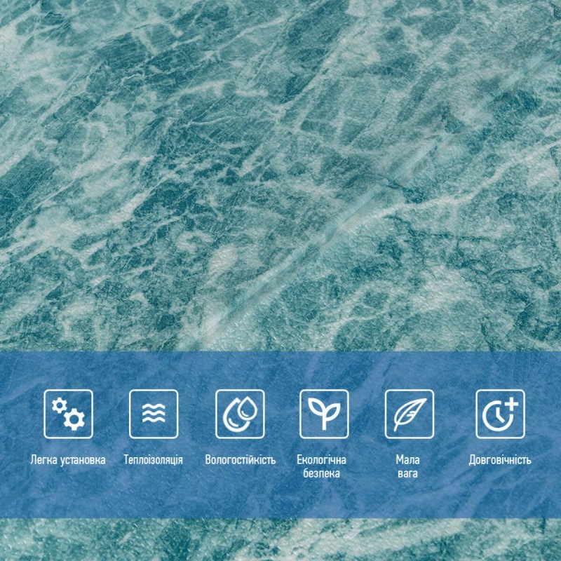 Декоративная панель "морская мраморная плитка" изготовлена из вспененного полипропилена. Это универсальный и плотный материал, но в то же время легкий. Его срок службы более 20 лет. Самоклеющиеся 3D панели из полипропилена - это быстрый ремонт с минимумом шума и строительного мусора.